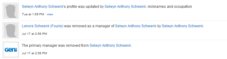 I have been removed as a manger of direct family (tree created by myself). The "new" manager is unknown to me and the timeline indicates "Geni" removed me. No notification. Now unable to update details of recently deceased individuals. Please can you advise how and why this was done without consent? I find this totally unacceptable.