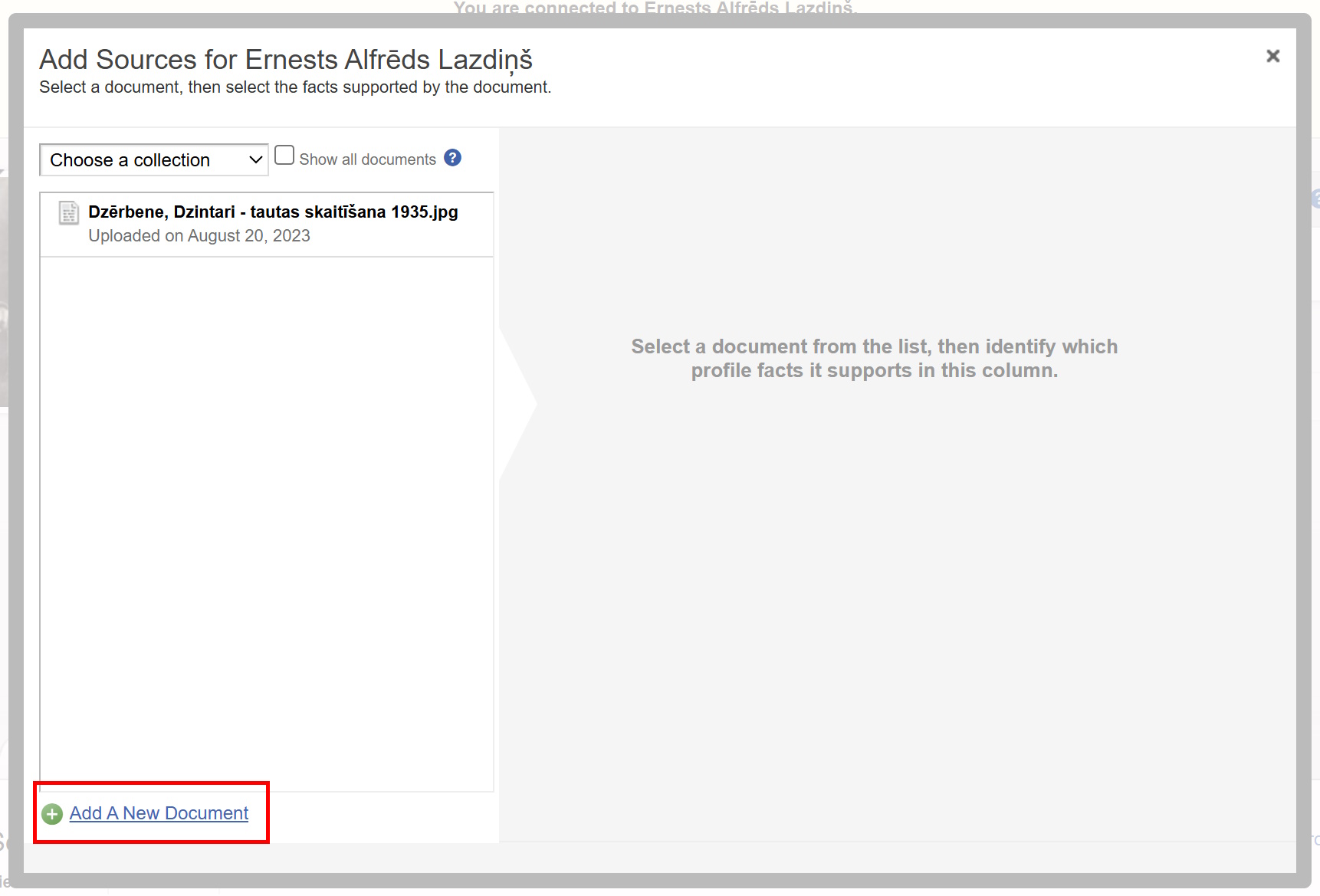 1. When you add source for person pressing "Add source" button then new dialog opens. But "Add new document" at the left bottom corner does nothing. It generates JavaScript exception (see images):