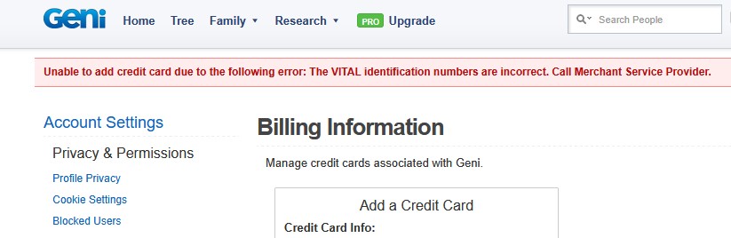 Hi, the payment form is not accepting any of my cards due to "VITAL information".