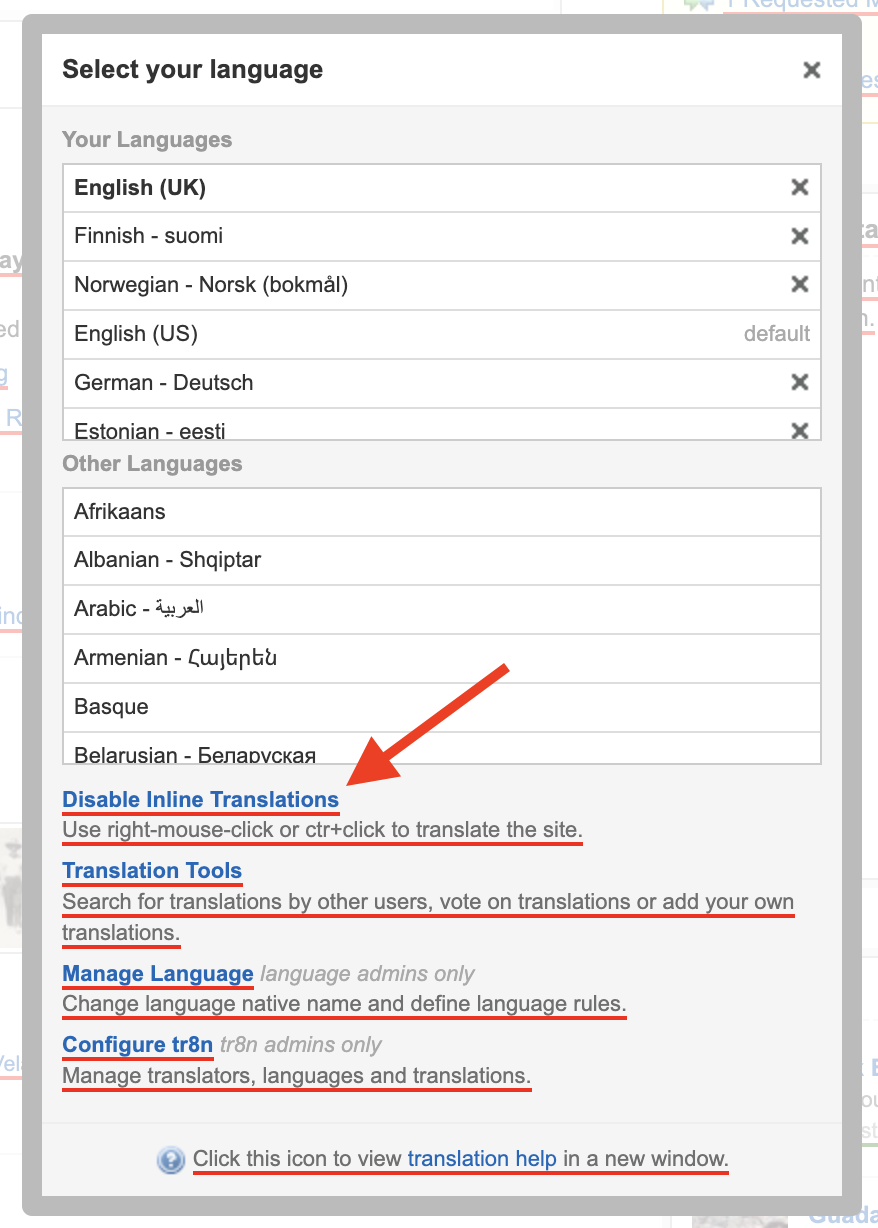Next click "Disable Inline Translations" to turn off the underlined phrases on the site.