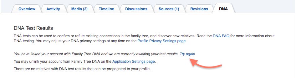 "After linking your accounts, your DNA test results will be automatically uploaded to your Geni profile and appear on the DNA tab (this is usually completed within a few minutes)."
