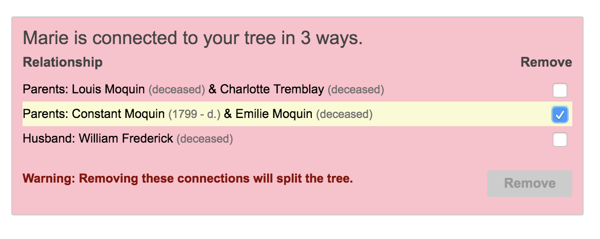 Was recently informed by a helpful amateur genealogist of an error in my tree, after looking at his information I agree and would like to make a changes, however I am getting the error that I can't remove her parents since it will split the tree.