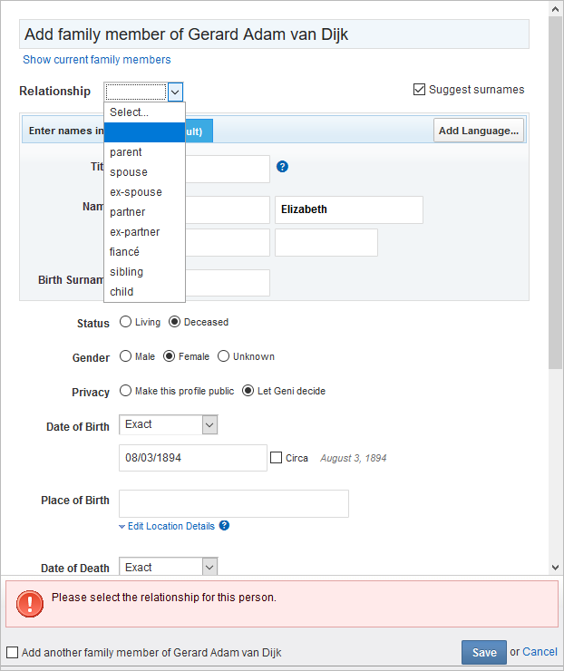 I am being forced to chose one of the options below when entering the mother of an illegitimate child of my great-grandfather's.