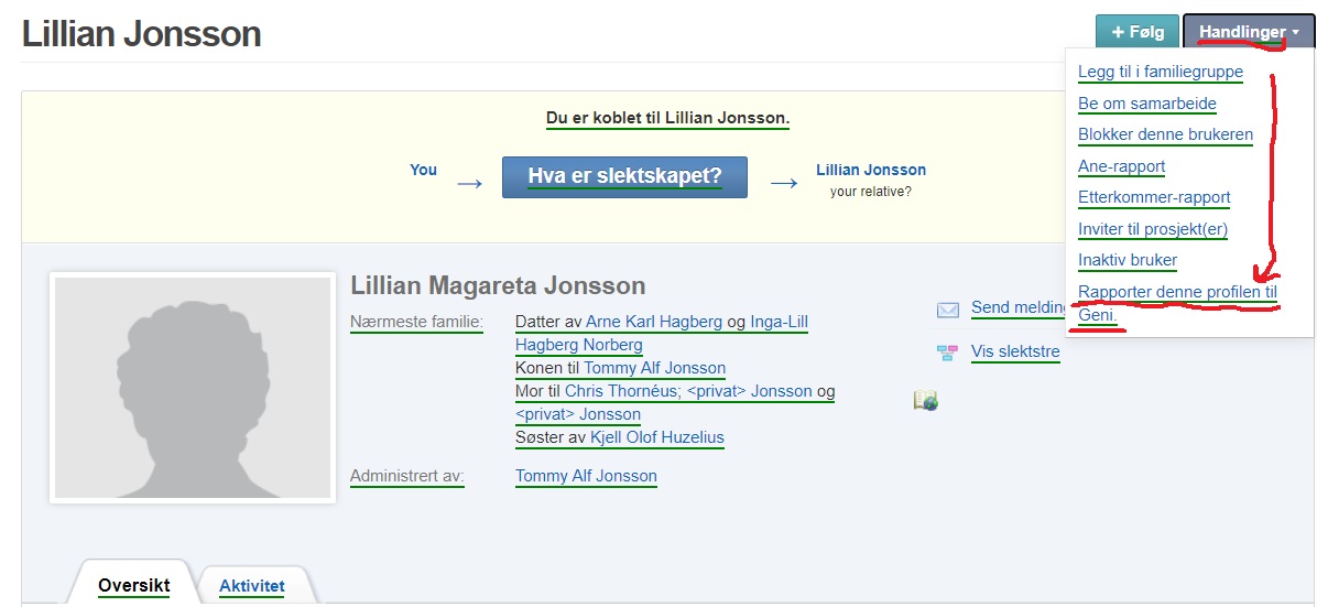 Torbjørn Igelkjøn Since this is a claimed profile (or user profile), you will have to report her as deceased.