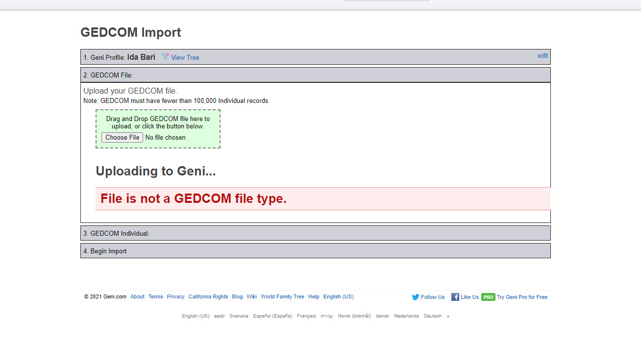Hello, I am trying to export my gedcom file but get a message about a different type of file. Can you help me,