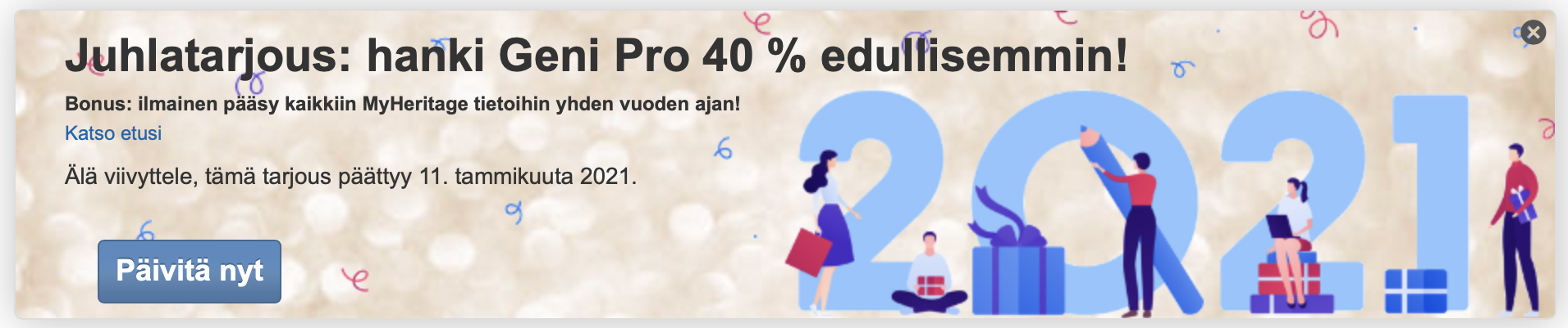 Geni Support Team Hi all, we're sorry for the confusion. The offer was set to expire on January 10, but we have now extended it to the 11th. You can still sign up for the offer by clicking on the link in the offer email or click here https://www.geni.com/pro/signup . You will see the discount applied.