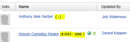 The second row ("Ansum C H") in your photo does already show the birth and death date, doesn't it? (1683 - 1688) How would you like it to be displayed differently?