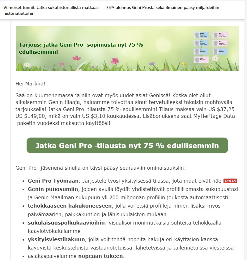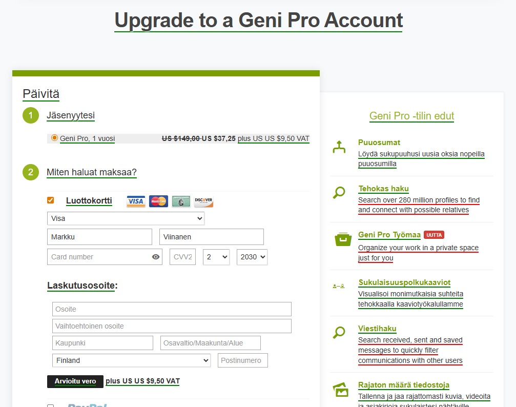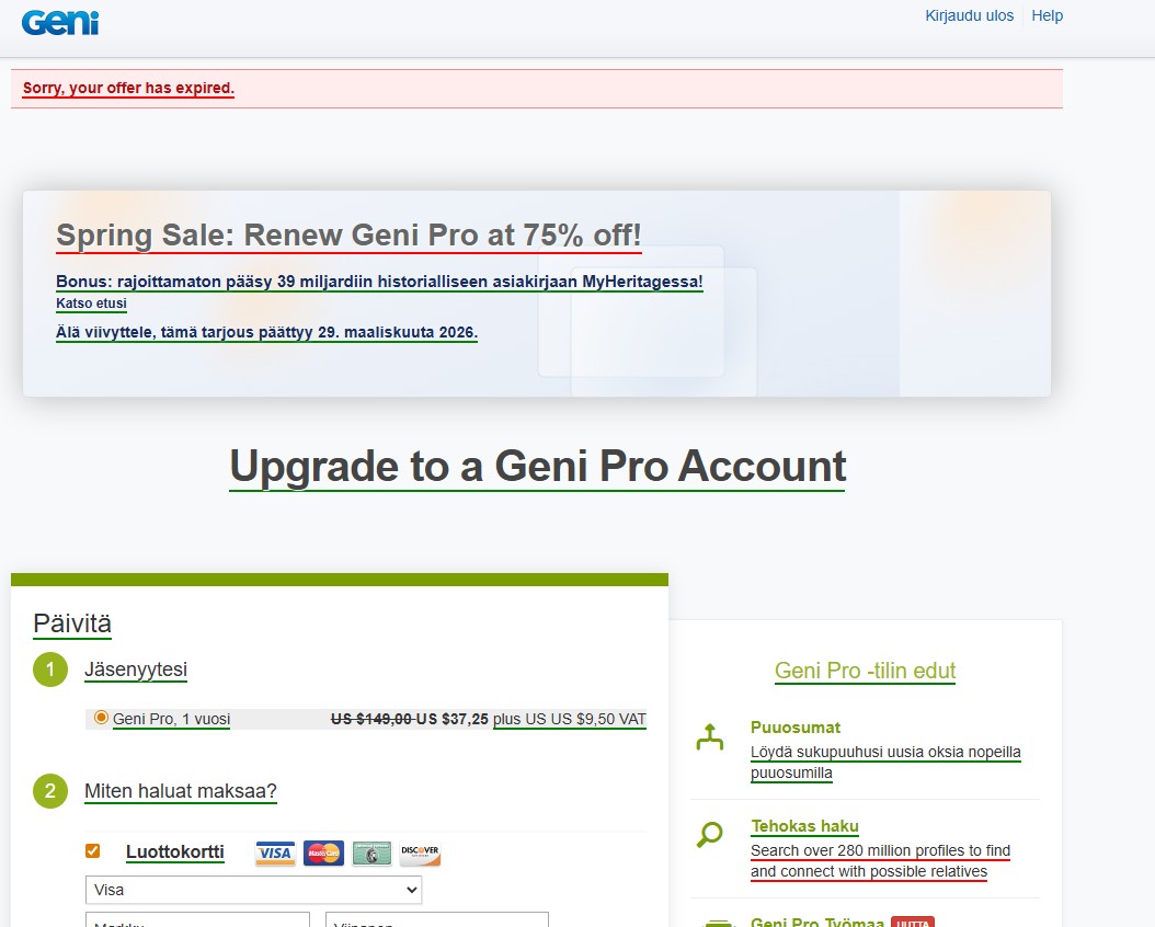 Hei! 29.3.2026 sain tarjouksen Geni Pro ja päätin ostaa sen?? Nyt kun menin geniin niin kuitenkin minulla oli Basic jäsenyys, vaikka mielestäni maksutapahtuma oli mennyt läpi ?? Toisaalta maksua ei kuitenkaan ollut veloitettu?? Mistä tässä on kysymys; mielestäni Geni on ennenkin tehnyt tämän saman tempun ?? Olen vieläkin kiinnostunut ostamaan tuon saamani "Tarjouksen" ? Geni kiinnostaa, mutta en vaan ole viimeaikoina ehtinyt käyttämään sitä ?
