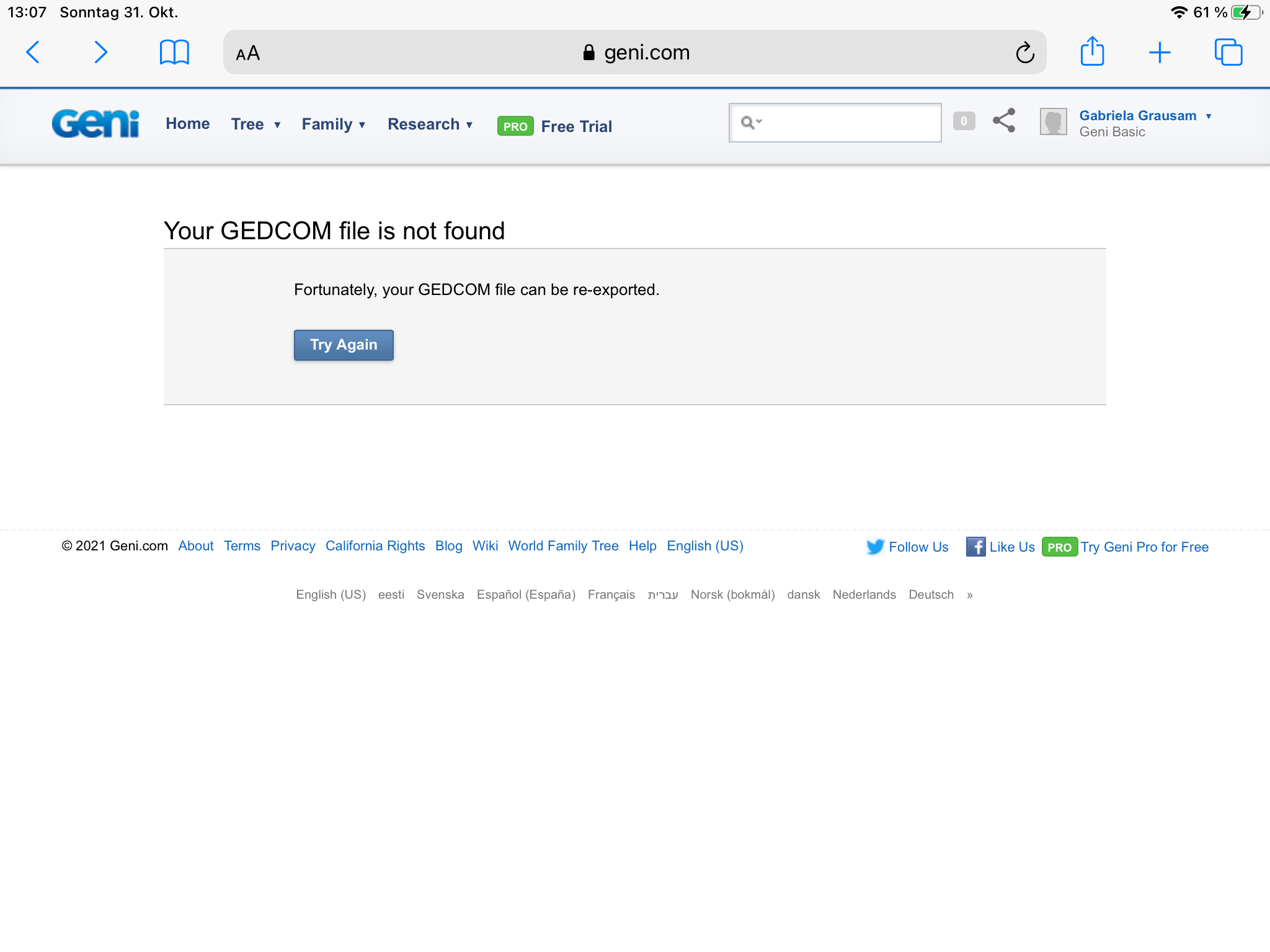 It could be that a GEDCOM stays only available for a certain time, also it takes time to create a GEDCOM and you should get an email with a link to download it from Geni when it is ready.